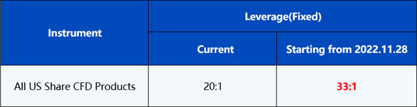 Please be advised that the leverage on all US Share CFDs products will be adjusted starting from 28th November 2022 to further optimise the competitiveness and improve the trading environment.