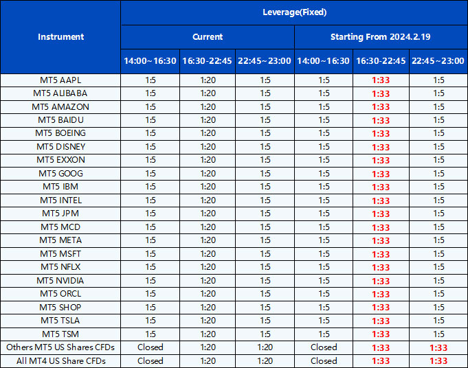 Please be advised that the leverage on all US Share CFDs products will be adjusted starting from 19th February 2024 to further optimise the competitiveness and improve the trading environment.