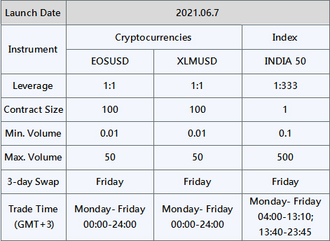 To provide a broader portfolio of products, Pacific Union will launch the new products of EOSUSD , XLMUSD and INDIA 50 as per the dates in the table below.